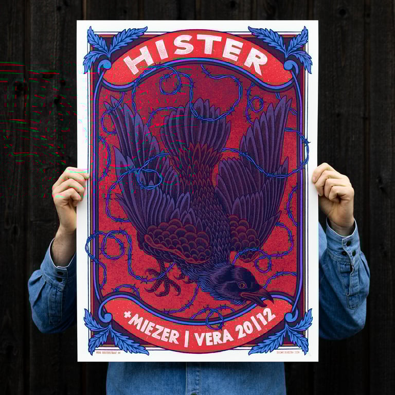 Screen printed gig poster for Hister + Miezer live at Vera Groningen (2024).