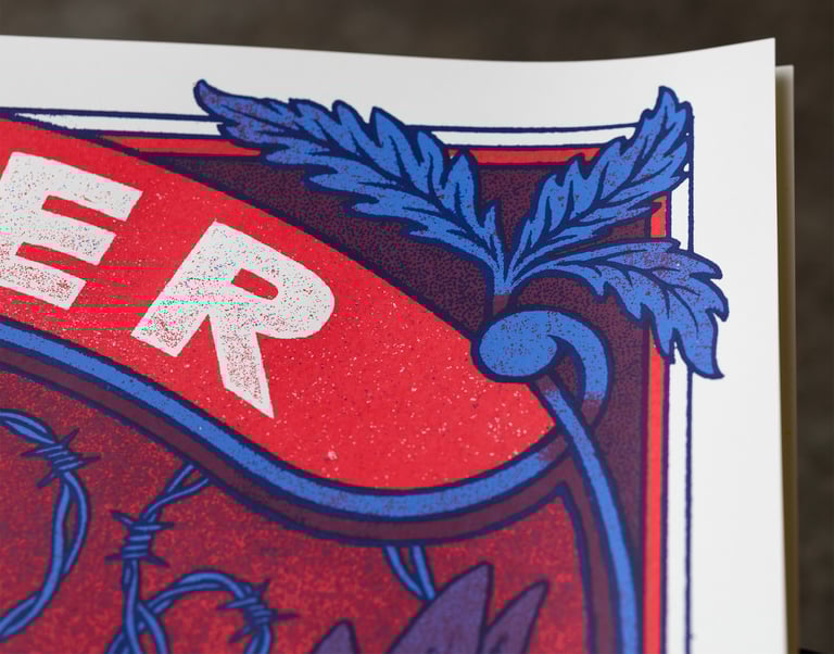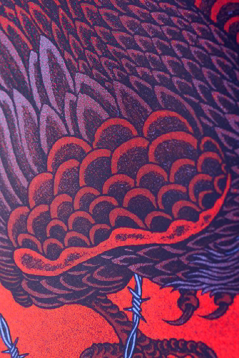 Three colors with overlaps. Screen printed on 240 gr bioset paper.