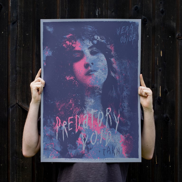 Screen printed gig poster for Predatory Void + Takh at Vera Groningen (2023).